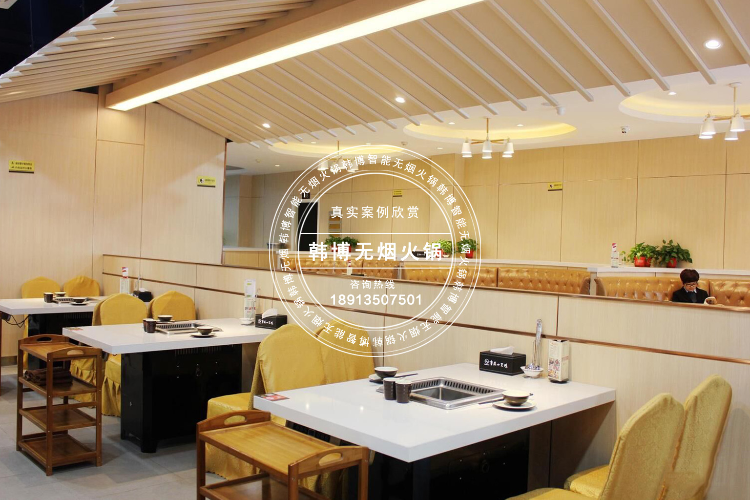 店里還特別安裝了智能無煙火鍋桌,桌子底下都裝有油煙凈化系統,是老板特別從韓博定制的,無需下排煙管道,吸煙率高達99%以上。