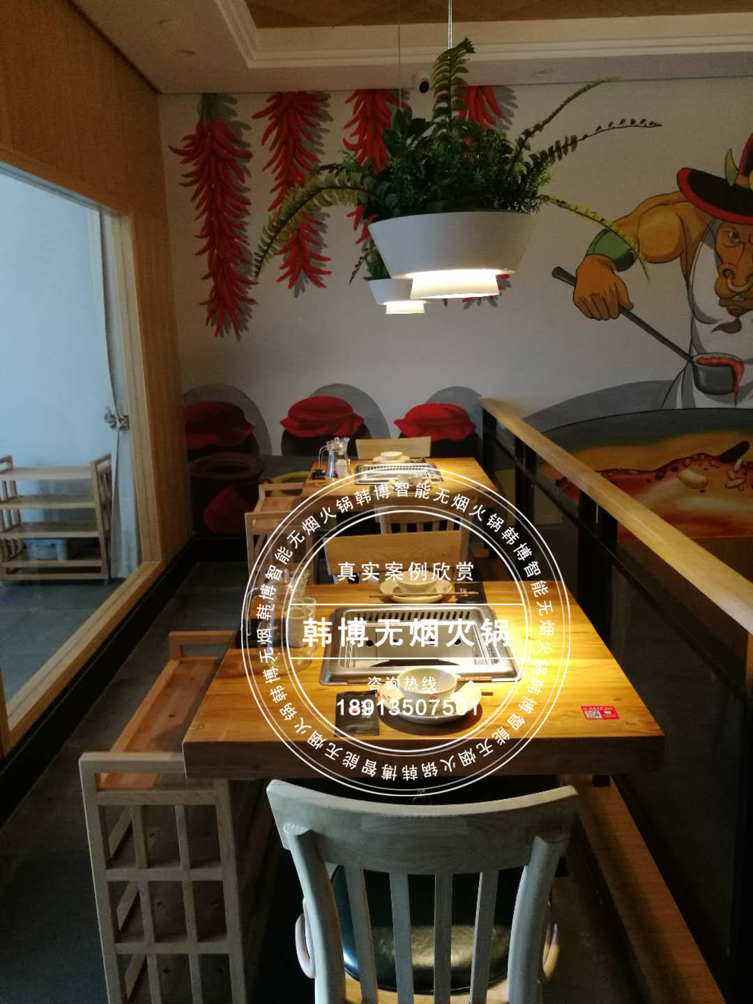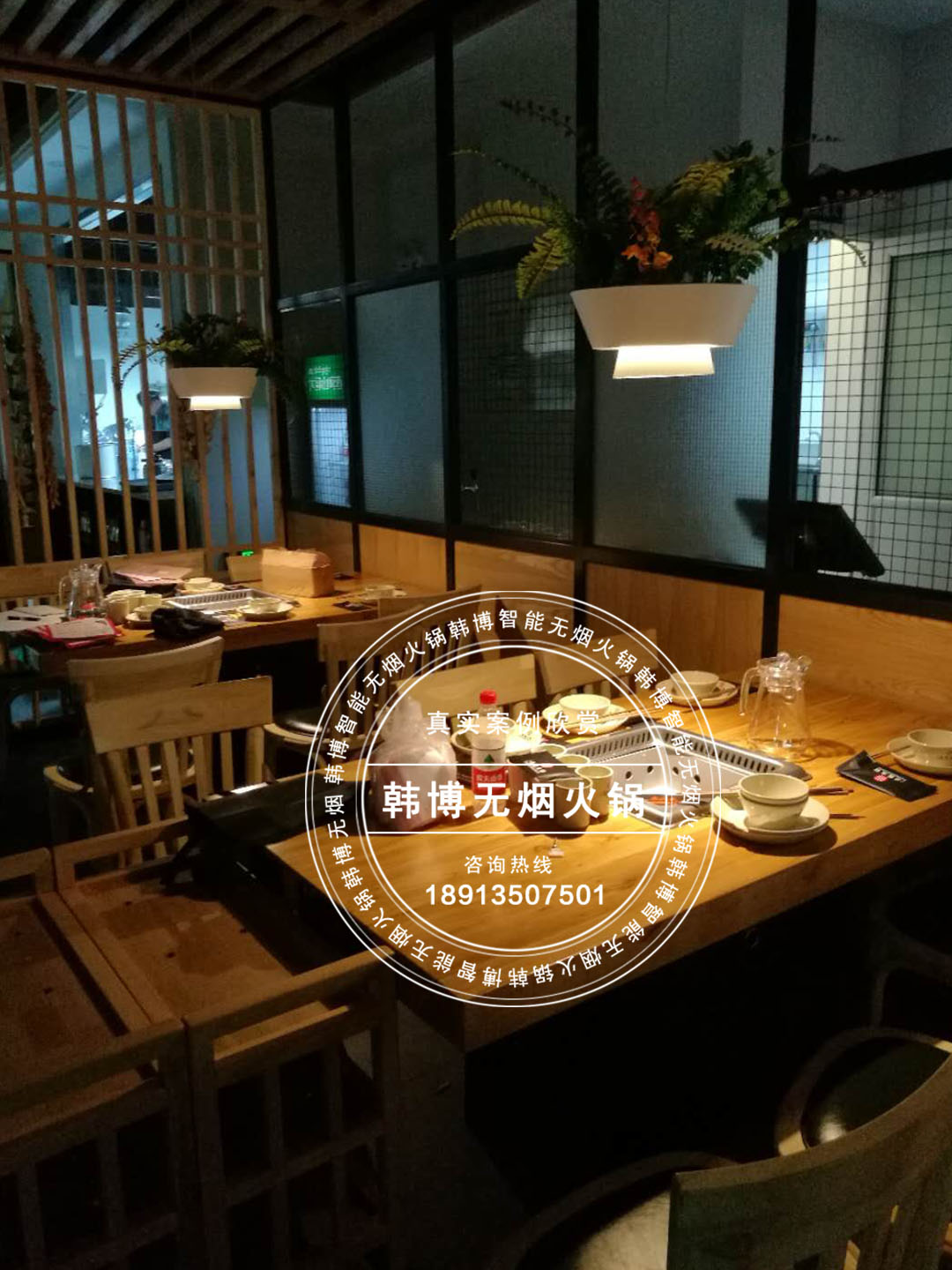 因為每張桌子都安裝了韓博智能無煙火鍋桌和油煙凈化系統,在這舒適而又別出心裁的環境中,顧客可以安逸無拘束的吃著火鍋。韓博無煙火鍋采用定制雙風輪低噪音風機,噪音控制在56分貝以下,油煙吸凈率高達99%以上。